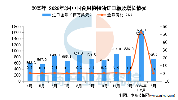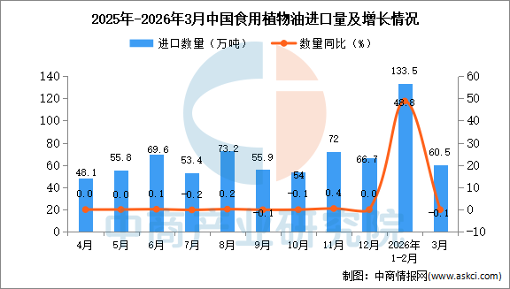 中商情报网讯:据中商产业研究院数据库显示,2026年3月中国食用植物油进口量60.5万吨,同比下降0.1%;1-3月我国食用植物油累计进口量194.1万吨,同比增长25.4%。