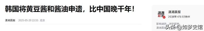 信息源:韩国将黄豆酱和酱油申遗,比中国晚千年!潇湘晨报2025-05-29。