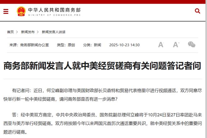 有记者问:近日,何立峰副总理与美国财政部长贝森特和贸易代表格里尔进行视频通话,双方同意尽快举行新一轮中美经贸磋商,请问商务部是否有进一步消息?