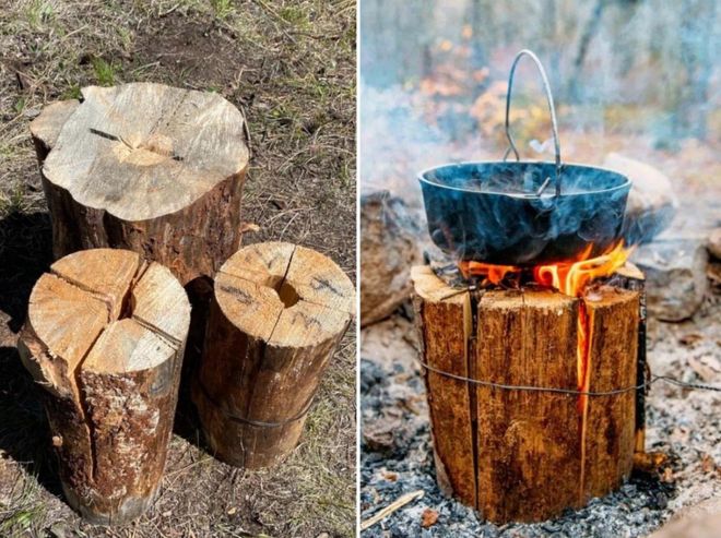 户外运动爱好者在野营时经常遇到一种怪模怪样的木头墩子,它是一种在圆木上切成四个口,再从中间点火燃烧的原木篝火。