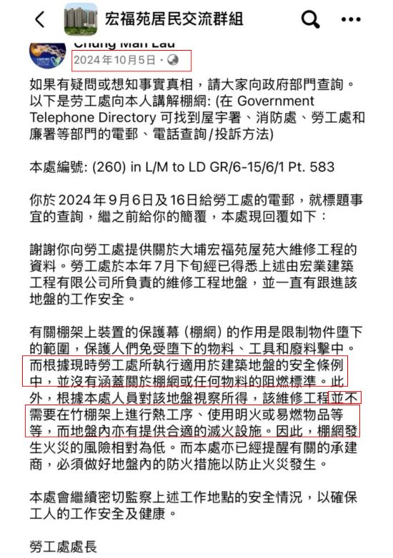 理论上,大规模建筑外装工程已经考虑到了消防设计。例如早在2024年10月,宏福苑居民曾向香港劳工处致信,反映了对外墙棚网及工程安全隐患的顾虑。劳工处官员在现场走访后认为: