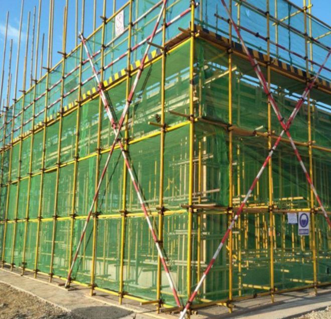 ”,具有安全环保、稳定性好的特点,但缺点是价格高,一般用于高层建筑的施工。绿色的防护网学名是“落地式脚手架”,采用“