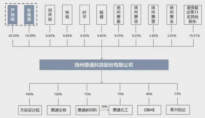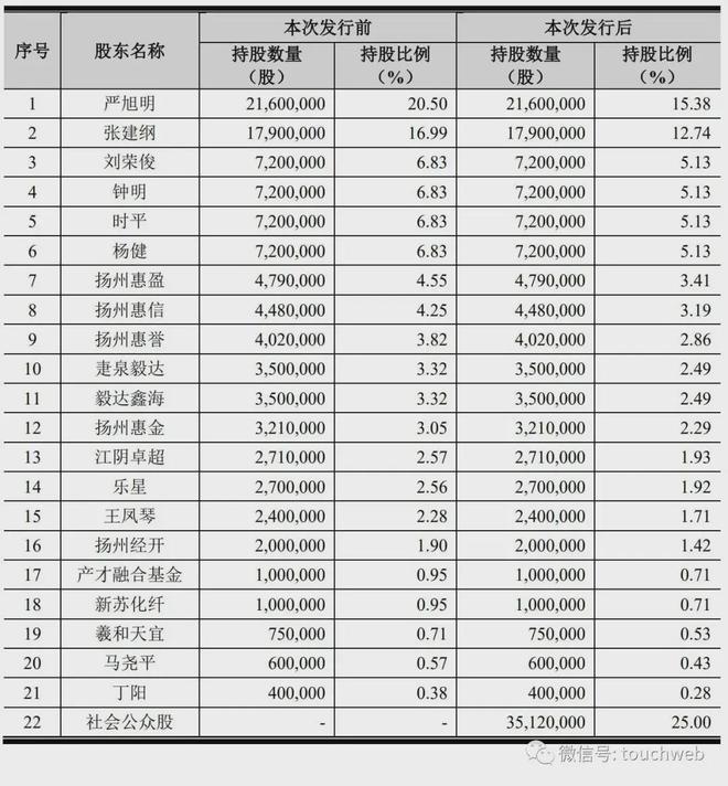 IPO前,严旭明、张建纲为公司实控人,合计直接和间接持有公司53.15%的股权。其中,严旭明直接持股为20.5%,还通过控制扬州惠信、扬州惠金合计持股7.3%,因此,严旭明直接和间接合计持股为27.8%。