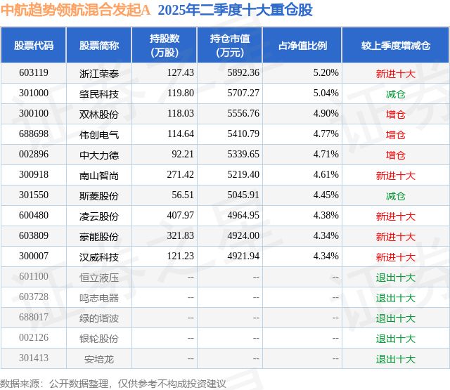根据2025基金半年报公募基金重仓股数据,重仓该股的公募基金共5家,其中持有数量最多的公募基金为中航基金的中航趋势领航混合发起A。中航趋势领航混合发起A目前规模为1.71亿元,最新净值2.3398(9月5日),较上一交易日上涨4.38%,近一年上涨146.71%。该公募基金现任基金经理为王森。王森在任的基金产品包括:中航恒宇港股通价值优选混合发起A,管理时间为2023年9月27日至今,期间收益率为13.62%;中航远见领航混合发起A,管理时间为2024年8月30日至今,期间收益率为40.34%;中航优选领航混合发起A,管理时间为2024年12月24日至今,期间收益率为113.9%。