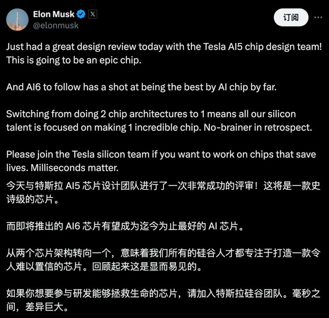「这意味着我们所有的硅谷人才都专注于打造一款令人难以置信的芯片。」最后,马斯克还不忘带动大家加入特斯拉的「硅谷团队」。
