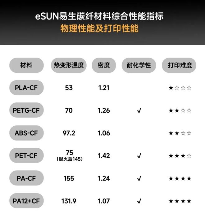 目前市面上常见的碳纤维增强3D打印材料包括:PLA-CF、PETG-CF、ABS-CF、PET-CF、PA-CF和PA12+CF等。如果你想一次尝试多种碳纤维材料,又只选择一个品牌,那么易生(eSUN)将是为数不多的选择。