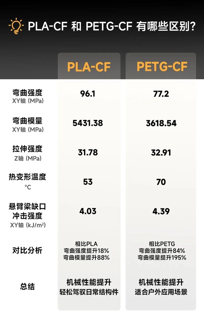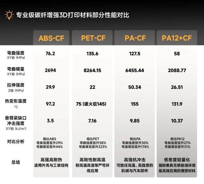 除了常见的PLA-CF和PETG-CF,市面上还提供如PET-CF、ABS-CF、PA-CF、PA12+CF等性能更强的碳纤维增强3D打印材料,进一步满足对高强度与多样化应用场景的需求。
