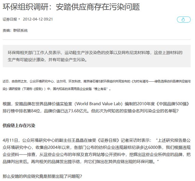 更早的。在2012年,就有权威媒体报道,有环保组织调查发现安踏供应链存环境污染问题,涉及运动鞋生产所需的皮革网布及尼龙材料等关键原材料。