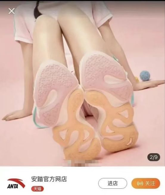 追溯到2022年5月,安踏新款女鞋的海报疑似打色情擦边球,该海报还被用在天猫平台安踏官方网店的首页位置,,也迅速冲上微博热搜榜。