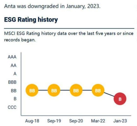 事实上,就在2023年,MSCI曾下调安踏ESG评级至“B”级。主要原因在于,安踏在供应链劳工管理标准、产品碳足迹等几个关键议题均被判定为落后水平。