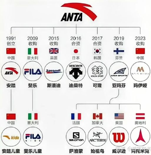 从2009年开始,安踏先后收购了意大利FILA、英国斯潘迪、日本迪桑特、韩国可隆、芬兰亚玛芬(旗下有萨洛蒙、始祖鸟、威尔逊等多个子品牌)、德国狼爪。特别是在2015-2019年期间,几乎以每年一次大收购的速度疯狂“买买买”,只有2018年收购彪马失手。