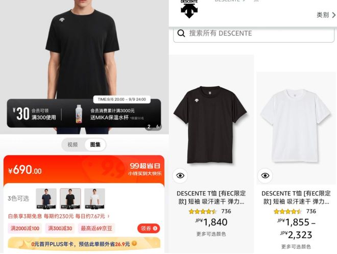 比如一件迪桑特Tough短袖,在京东旗舰店售价690元;在日本亚马逊上,外观相似的短袖,优惠价不到2000日元,折合人民币在100元以内,价格相差了7倍左右。