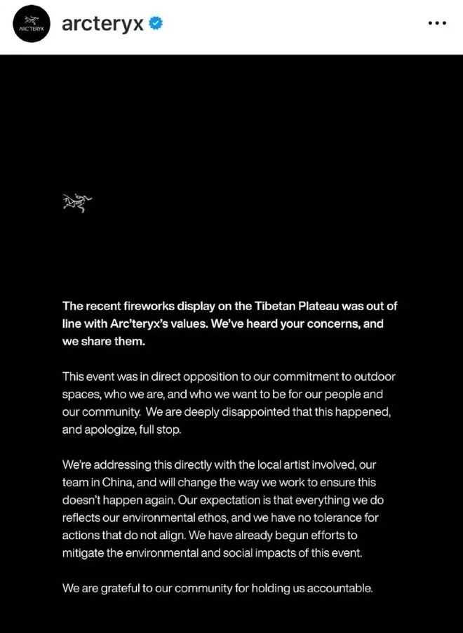 仅3天后,安踏旗下的增长引擎、正处于巅峰时段的户外品牌——始祖鸟,在海拔5500米的喜马拉雅山区赞助了一场名为《升龙》的烟花秀,这场与其宣传语“敬畏自然”背道而驰的行为艺术,彻底引爆舆论场,不但户外品牌形象尽毁,而且还引来了相关部门的立案与处罚。