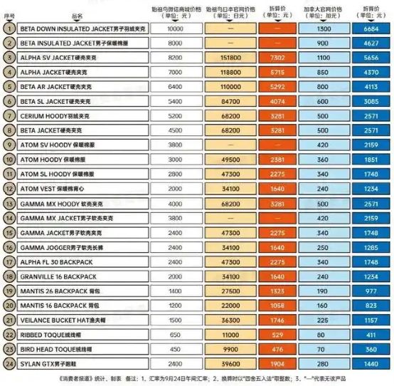 《消费者报道》记者对比了始祖鸟羽绒夹克、保暖棉服、绒线款产品在始祖鸟微信商城、日本和加拿大官网的售价,发现除了BIRD HEAD TOQUE绒线帽之外,其余产品均是国内价格最高,加拿大官网售价普遍最低,而且价格差明显,从几百到上千元不等。