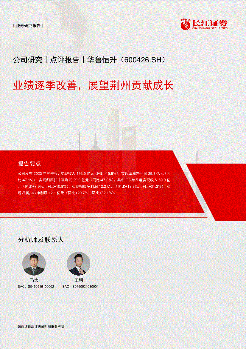 分析师及联系人马太王明 SAC:S02 SAC:丨证券研究报告丨更多研报请访问长江研究小程序华鲁恒升(600426.SH) 业绩逐季改善,展望荆州贡献成长公司研究丨点评报告投资评级买入丨维持事件描述公司发布2023年三季报,实现收入193.5亿元(同比-15.9%),实现归属净利润29.3亿元(同比-47.1%),实现归属扣非净利润29.0亿元(同比-47.0%)。
