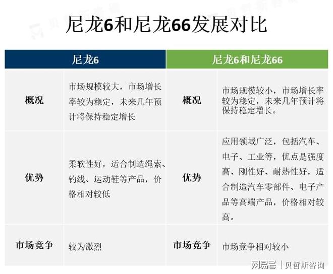 尼龙6市场规模较大,应用领域广泛,包括纺织、汽车、电子、运动用品等,优点是柔软性好,适合制造绳索、钓线、运动鞋等产品,价格相对较低,市场竞争较为激烈。尼龙6的市场增长率较为稳定,未来几年预计将保持稳定增长。尼龙66市场规模较小,但应用领域广泛,包括汽车、电子、工业等,优点是强度高、刚性好、耐热性好,适合制造汽车零部件、电子产品等高端产品,价格相对较高,市场竞争相对较小。尼龙66的市场增长率较为稳定,未来几年预计将保持稳定增长。