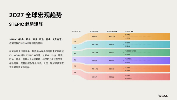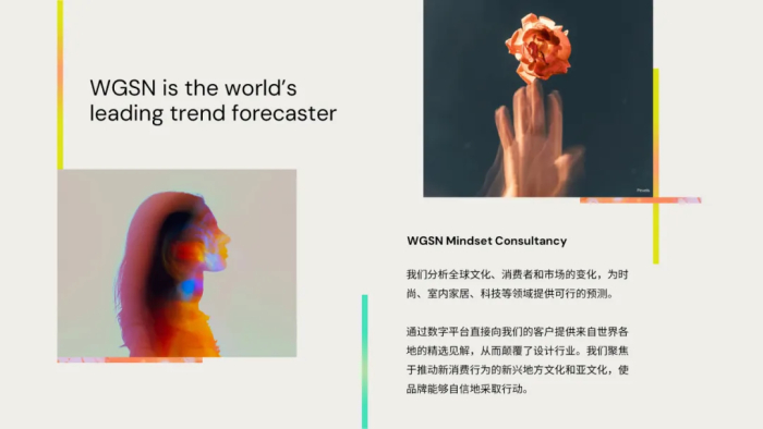 其核心价值在于,将宏观趋势转化为以消费者洞察为核心的可执行策略,为时尚、室内家居、科技、美妆、食品饮料及生活方式等领域提供精准的未来趋势指引。通过深刻理解消费者的需求、价值观与生活方式变迁,WGSN 助力企业与品牌在产品开发、设计创新、市场营销及零售策略上做出前瞻性决策,精准对接未来消费需求,从而在快速变化的市场中保持竞争优势、驱动业务增长。