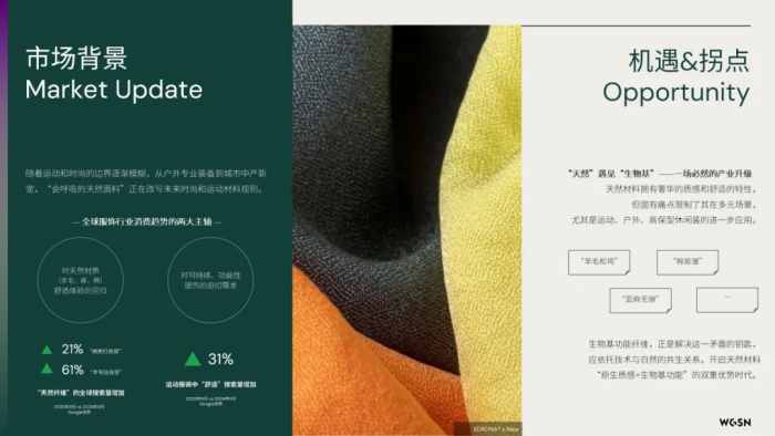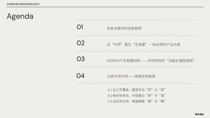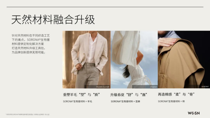 生物基材料品牌SORONA®联合国际趋势预测机构WGSN共同打造的《让自然新生:生物基功能纤维应用趋势白皮书》,其不仅可以满足产业环保可持续发展与纺织品全生命周期绿色升级需求,还将赋予天然面料产品以更多功能性和市场差异化优势。,为产业带来更多可能,为消费者日常多元场景提供更为贴心、专业的解决方案。