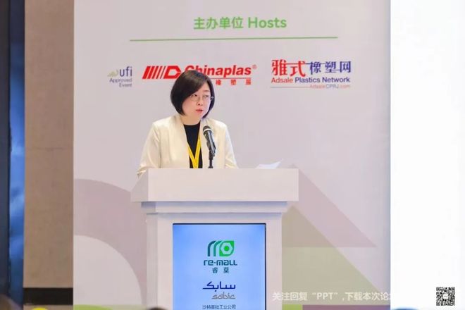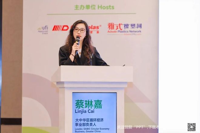 沙特基础工业公司大中华区循环经济事业部负责人蔡琳嘉介绍了SABIC的循环经济举措推出TRUCIRCLE™方案,提供认证循环及可再生材料,已应用于食品包装、医疗等领域,并获ISCC PLUS认证。