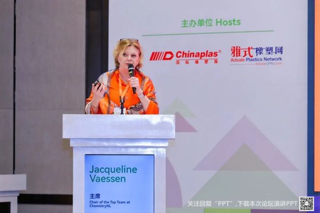 荷兰化学工业领导小组主席 Jacqueline Vaessen介绍了荷兰化工行业在推动可持续发展的进展。她指出,目前该工作组正在推进多个项目,涉及电池技术、创新绿色能源供应,新一代生物燃料、循环化材料、构建生物基原料价值链、碳捕集及利用等领域。