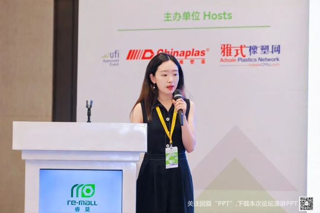 威立雅(中国)环境服务有限公司固废与回收商务经理刘晓姝介绍了公司在全球的回收供应链及全新的循环塑料品牌PlastiLoop。