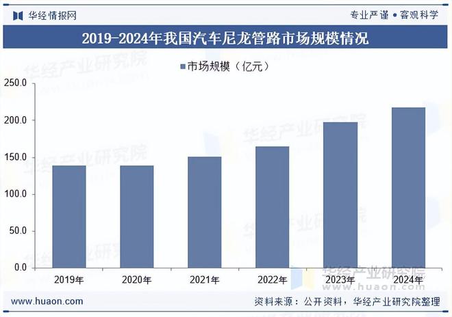 随着新材料和技术的发展,如国六的动力系统管路会因为排放、导电等要求而采用更大规格、价值更高的管材及配件。尼龙管路更符合环保化、轻量化的汽车行业发展趋势。由于新能源汽车对传统燃油车的替代趋势,乘用车尼龙流体管路将全面应用于新能源汽车三电系统热管理及空调系统的热管理。据统计2024年我国汽车尼龙管路市场规模达到了217.44亿元,同比增长9.6%。