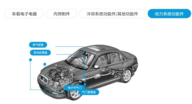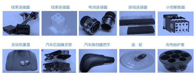汽车领域包括从内/外部功能件,到温控系统,入气系统及发动机;电子电气领域提供高耐温,高阻燃改性料,还可进行电镀、焊接、印刷等定制化开发。