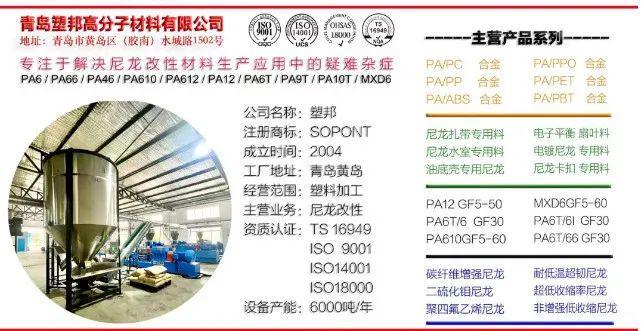 青岛塑邦高分子材料有限公司专注于尼龙和POM 改性加工和销售,主要产品有:超韧耐寒尼龙,玻纤增强尼龙,耐高温尼龙,二硫化钼尼龙,聚四氟尼龙,碳纤增强尼龙,导电尼龙,导热尼龙,高光尼龙,尼龙高效无卤阻燃母粒(添加5-8%)等。