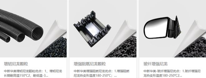 中新华美的改性尼龙品类有PA6和PA66,改性方向主要是增强和阻燃。应用于汽车散热器格栅、发动机部件、汽车反光镜骨架、汽车反光镜壳体、变压器线圈骨架、电动工具外壳、体育运动器材、机械配件、电梯部件、电气接插件等。