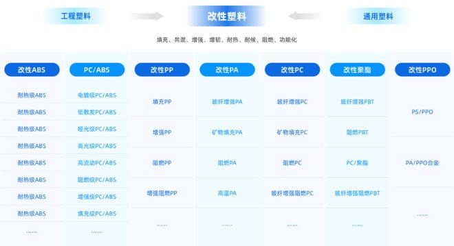 公司产品涵盖ABS、PP、PS、PVC等通用塑料改性及PC、PA、PPO、PPS等工程塑料改性,已建立了阻燃、增强、耐候、高光、免喷涂、生物降解等多个系列塑料改性技术体系。