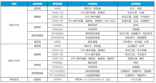 具体包括微晶结构透明尼龙系列、记忆性透明尼龙系列、高温尼龙PPA系列、超低密度高强度产品系列、3D吹塑级尼龙系列、挤出级长链尼龙系列、长期耐高温PA66/PA6系列、以塑代钢产品系列等。