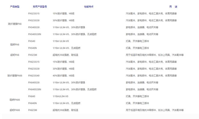 尼龙品类有主要是PA6和PA66,改性方向包括增强、增韧、阻燃,产品应用有汽车,轨道交通,工业机械等多个领域。