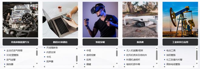 产品涵盖PA系列、PBT、PC、PP、PS、碳纤维材料及3D打印系列材料,广泛应用于电子电工、汽车配件、家电、通讯器材、医疗及精密光学设备等领域。