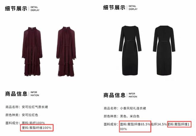高端品牌都在用聚酯纤维,老钱品牌女装朗姿,灯笼袖雪纺连衣裙售价1880,但里料是100%聚酯纤维。